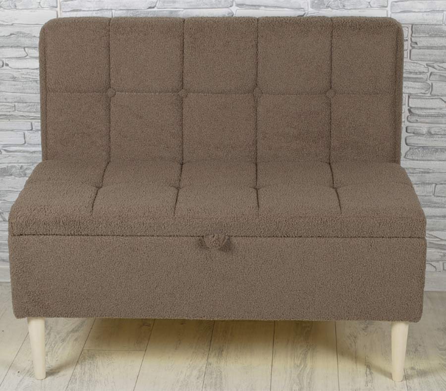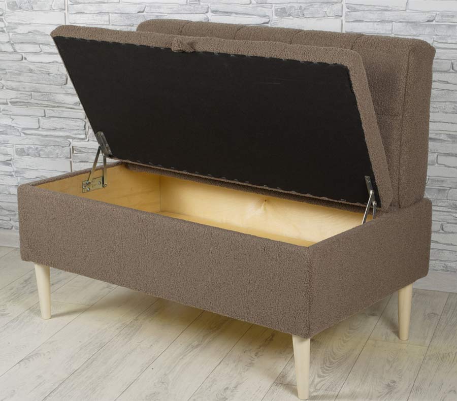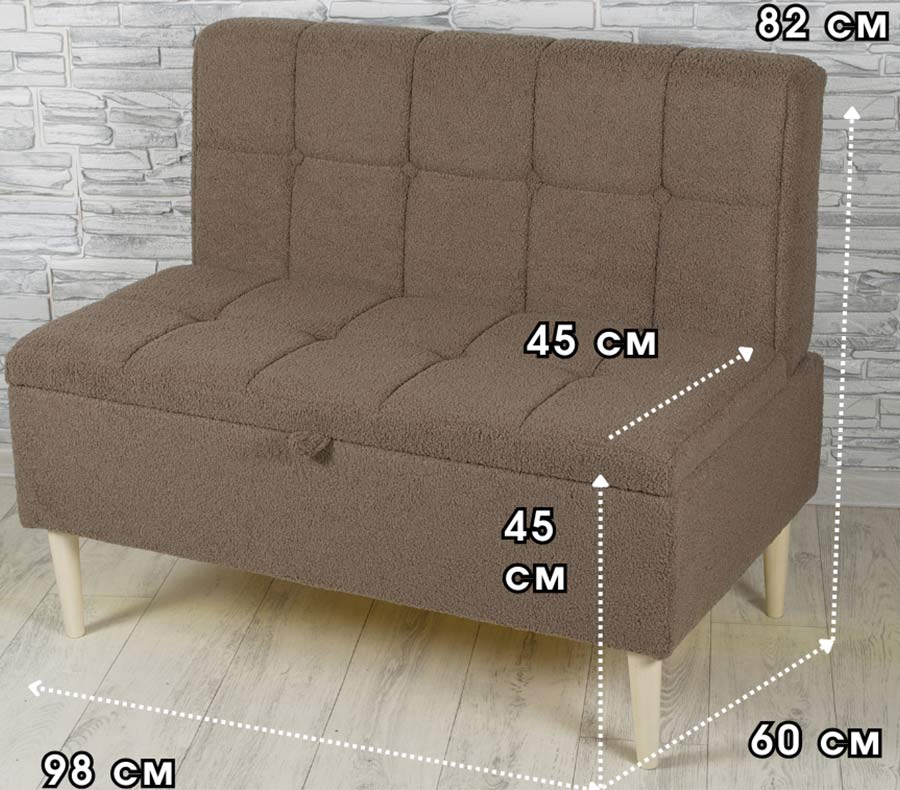 Ширина лавки всего 98 см, она легко встанет на балкон, в лоджию, на веранду, в прихожую, в коридор, в маленькую кухню, в зону ожидания. Ткань изделия букле. Все материалы гипоаллергенны и безопасны для здоровья. Размер вместительного ящика для ваших вещей: 560х940х185 мм. Фото сделаны при профессиональном свете, цвет изделия может незначительно отличаться в жизни из-за освещения в вашей комнате.